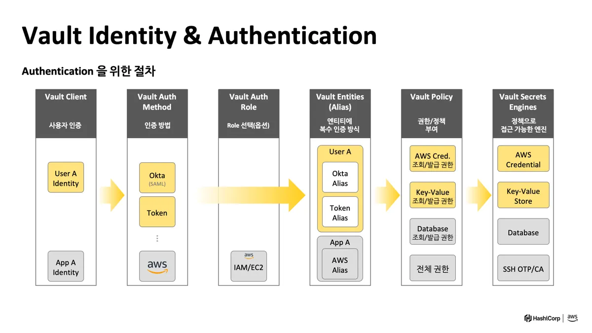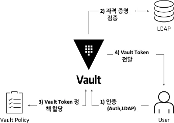 - 인증 : 신원 확인 (사원증 찍기) - Vault에서 인증된 사용자에게 토큰 발급