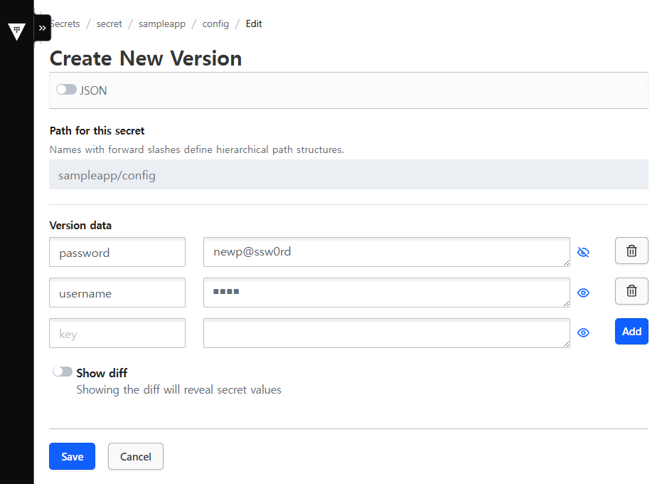 (⎈|kind-myk8s:vault) root@DESKTOP-HUU6SC7:/mnt/e/vscode_go/vault# kubectl get mutatingwebhookconfigurations.admissionregistration.k8s.io NAME WEBHOOKS AGE vault-agent-injector-cfg 1 141m (⎈|kind-myk8s:vault) root@DESKTOP-HUU6SC7:/mnt/e/vscode_go/vault# kubectl exec -it -n vault deploy/nginx-vault-demo -c vault-agent-sidecar -- vault agent -h Usage: vault agent [options] This command starts a Vault Agent that can perform automatic authentication in certain environments. Start an agent with a configuration file: $ vault agent -config=/etc/vault/config.hcl For a full list of examples, please see the documentation. (⎈|kind-myk8s:vault) root@DESKTOP-HUU6SC7:/mnt/e/vscode_go/vault# kubectl exec -it -n vault deploy/nginx-vault-demo -c vault-agent-sidecar -- cat /etc/vault/approle/secret_id ca1db9ed-0f2c-44f5-4e98-5244bf694eca (⎈|kind-myk8s:vault) root@DESKTOP-HUU6SC7:/mnt/e/vscode_go/vault# kubectl exec -it -n vault deploy/nginx-vault-demo -c nginx -- cat /usr/share/nginx/html/index.html <html> <body> <p>username: demo</p> <p>password: p@ssw0rd</p> </body> </html> - KV 값 변경 후 확인
