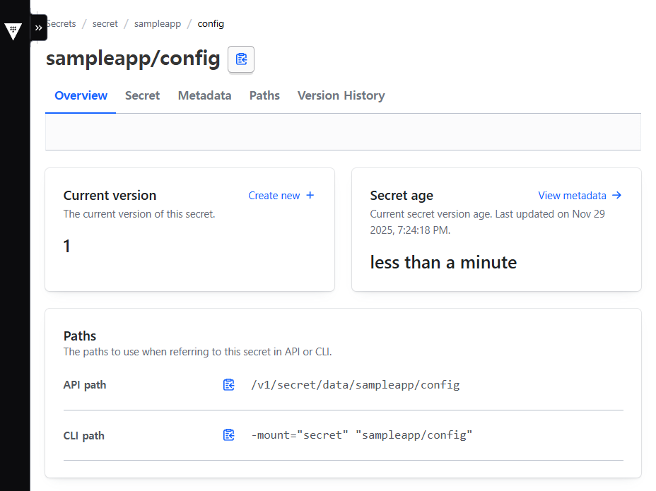 (⎈|kind-myk8s:vault) root@DESKTOP-HUU6SC7:/mnt/e/vscode_go/vault# k describe deploy vault-injected-ui Name: vault-injected-ui Namespace: vault CreationTimestamp: Sat, 29 Nov 2025 22:04:00 +0900 Labels: <none> Annotations: deployment.kubernetes.io/revision: 1 Selector: app=vault-injected-ui Replicas: 1 desired | 1 updated | 1 total | 0 available | 1 unavailable StrategyType: RollingUpdate MinReadySeconds: 0 RollingUpdateStrategy: 25% max unavailable, 25% max surge Pod Template: Labels: app=vault-injected-ui Annotations: vault.hashicorp.com/agent-inject: true vault.hashicorp.com/agent-inject-output-path: /vault/secrets vault.hashicorp.com/agent-inject-secret-config.json: secret/data/sampleapp/config vault.hashicorp.com/agent-inject-template-config.json: {{- with secret "secret/data/sampleapp/config" -}} { "username": "{{ .Data.data.username }}", "password": "{{ .Data.data.password }}" } {{- end }} vault.hashicorp.com/role: sampleapp-role Service Account: vault-ui-sa Containers: app: Image: python:3.10 Port: 5000/TCP Host Port: 0/TCP Command: sh -c Args: pip install flask && cat <<PYEOF > /app.py import json, time from flask import Flask, render_template_string app = Flask(__name__) while True: try: with open("/vault/secrets/config.json") as f: secret = json.load(f) break except: time.sleep(1) @app.route("/") def index(): return render_template_string("<h2>🔐 Vault Injected UI</h2><p>👤 사용자: {{username}}</p><p>🔑 비밀번호: {{password}}</p>", **secret) app.run(host="0.0.0.0", port=5000) PYEOF python /app.py Environment: <none> Mounts: <none> Volumes: <none> Node-Selectors: <none> Tolerations: <none> Conditions: Type Status Reason ---- ------ ------ Progressing True NewReplicaSetAvailable Available False MinimumReplicasUnavailable OldReplicaSets: <none> NewReplicaSet: vault-injected-ui-77fb865789 (1/1 replicas created) Events: Type Reason Age From Message ---- ------ ---- ---- ------- Normal ScalingReplicaSet 10m deployment-controller Scaled up replica set vault-injected-ui-77fb865789 from 0 to