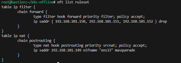 bastion에서는 NAT(MASQUERADE)를 통해 내부 트래픽이 외부로 나갈 수 있게 하되, admin/k8s-node의 트래픽은 외부로 포워딩되지 않도록 DROP 규칙을 추가합니다.
